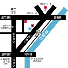 G: 銀座線浅草駅2番出口より徒歩1分 A: 都営浅草線A5出口より右2軒隣 T: 東武線浅草駅より徒歩2分 ◆都営大江戸線蔵前駅A5出口より徒歩15分 ◆つくばエクスプレス浅草駅A1出口より徒歩10分 ◆江戸通り(国道6号)沿い/雷門郵便局斜め前